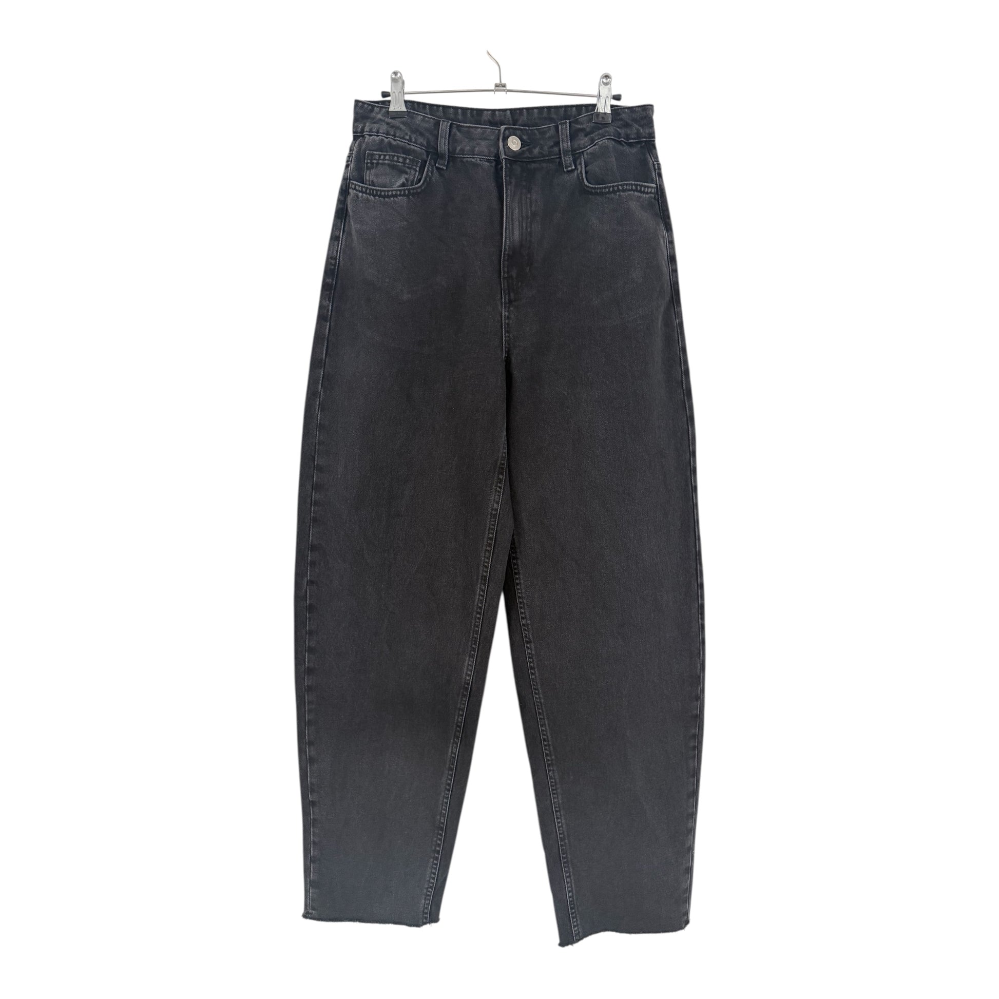 BARREL LEG JEAN WITH A HIGH RISE WAIST & RAW HEM.